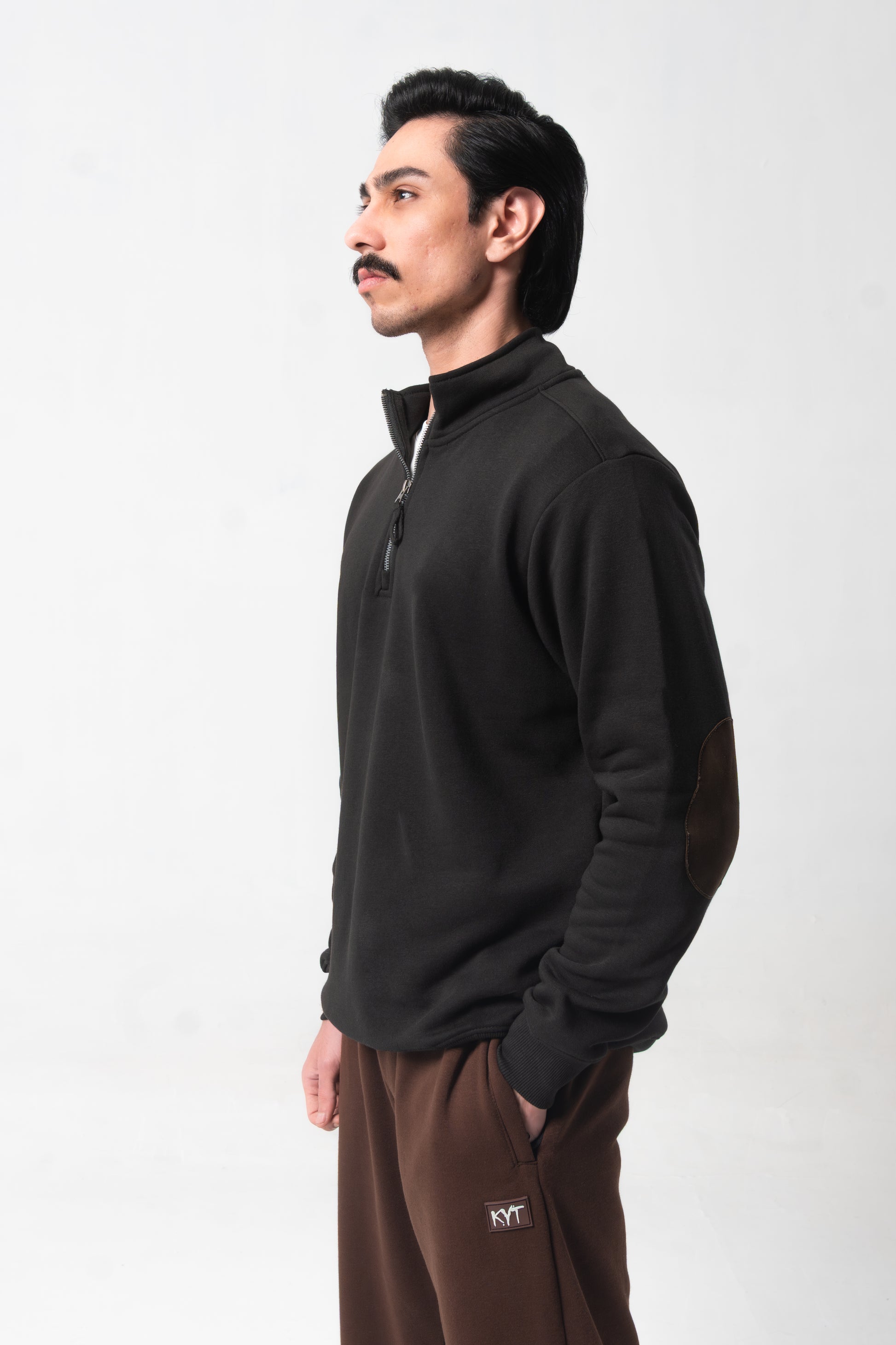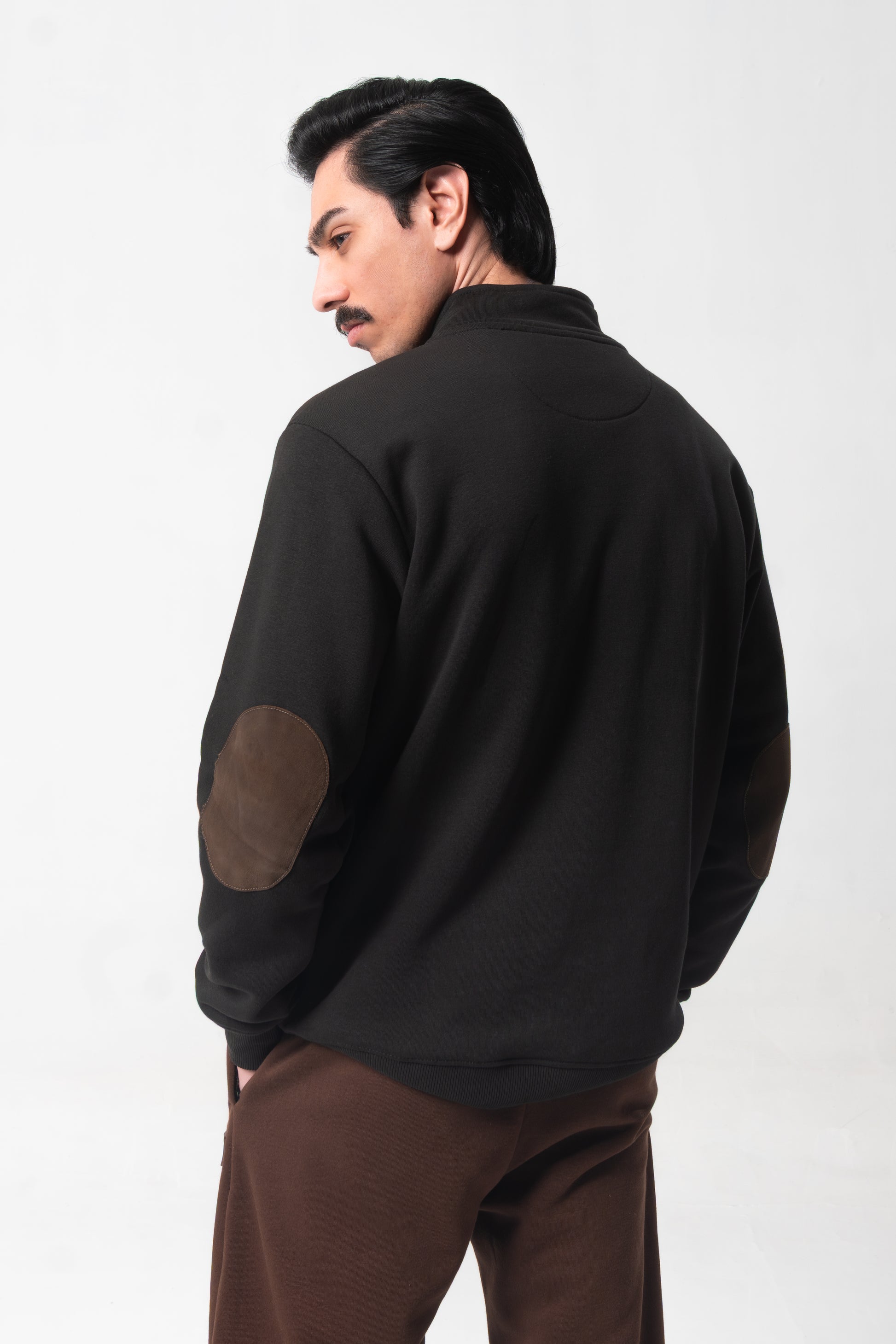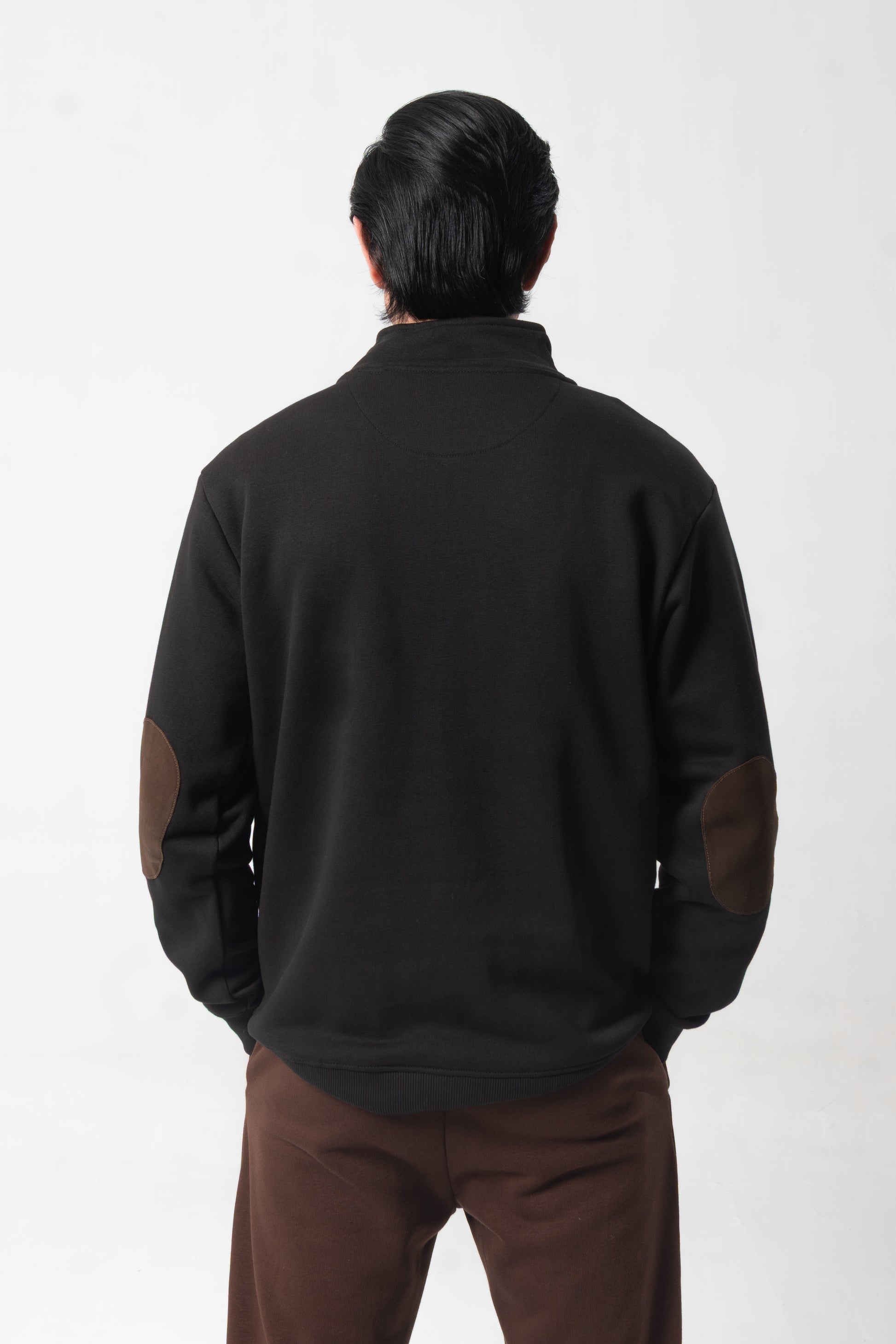 Design: Quarter-zip featuring a stand collar and contrast elbow patches
